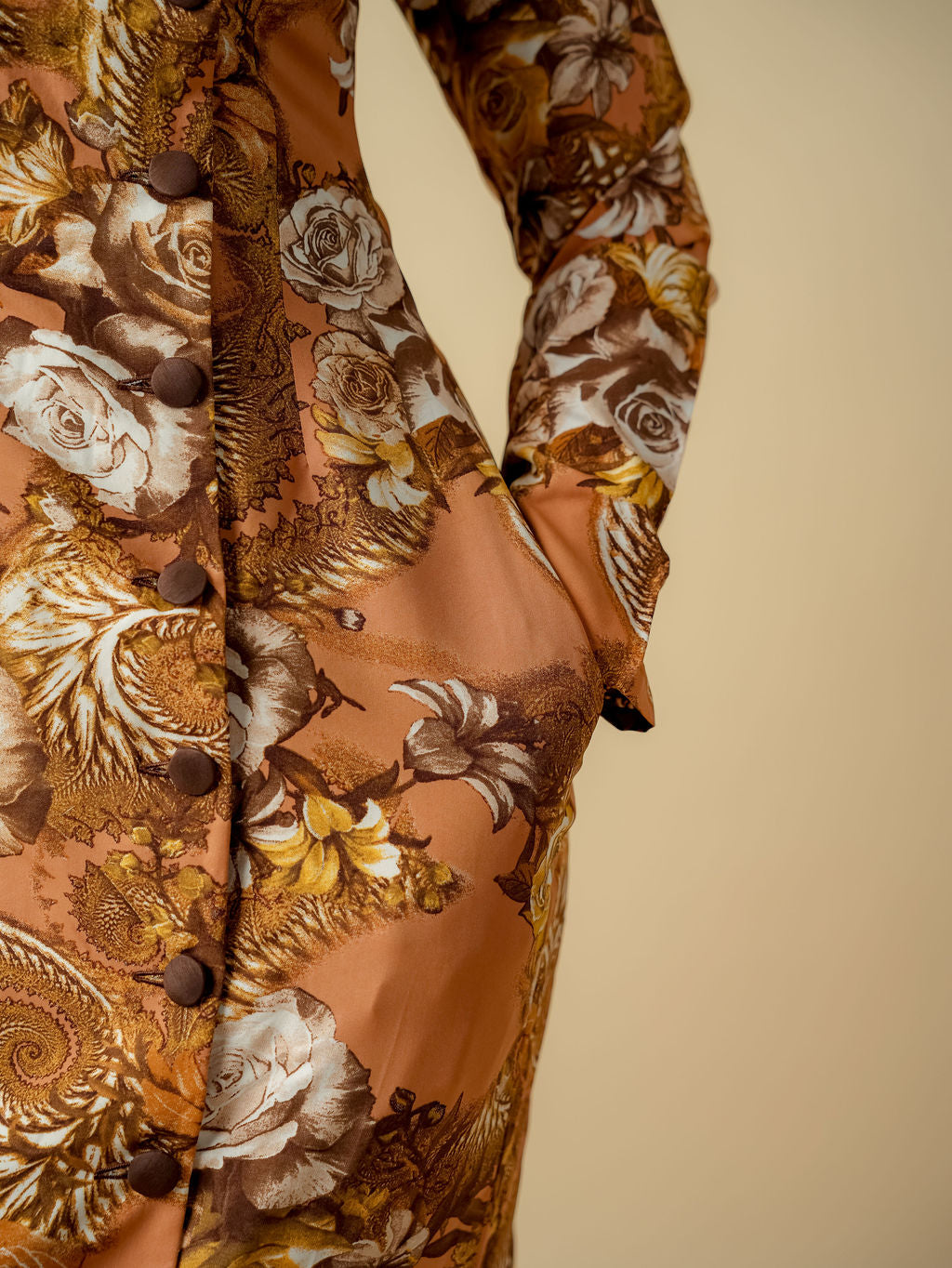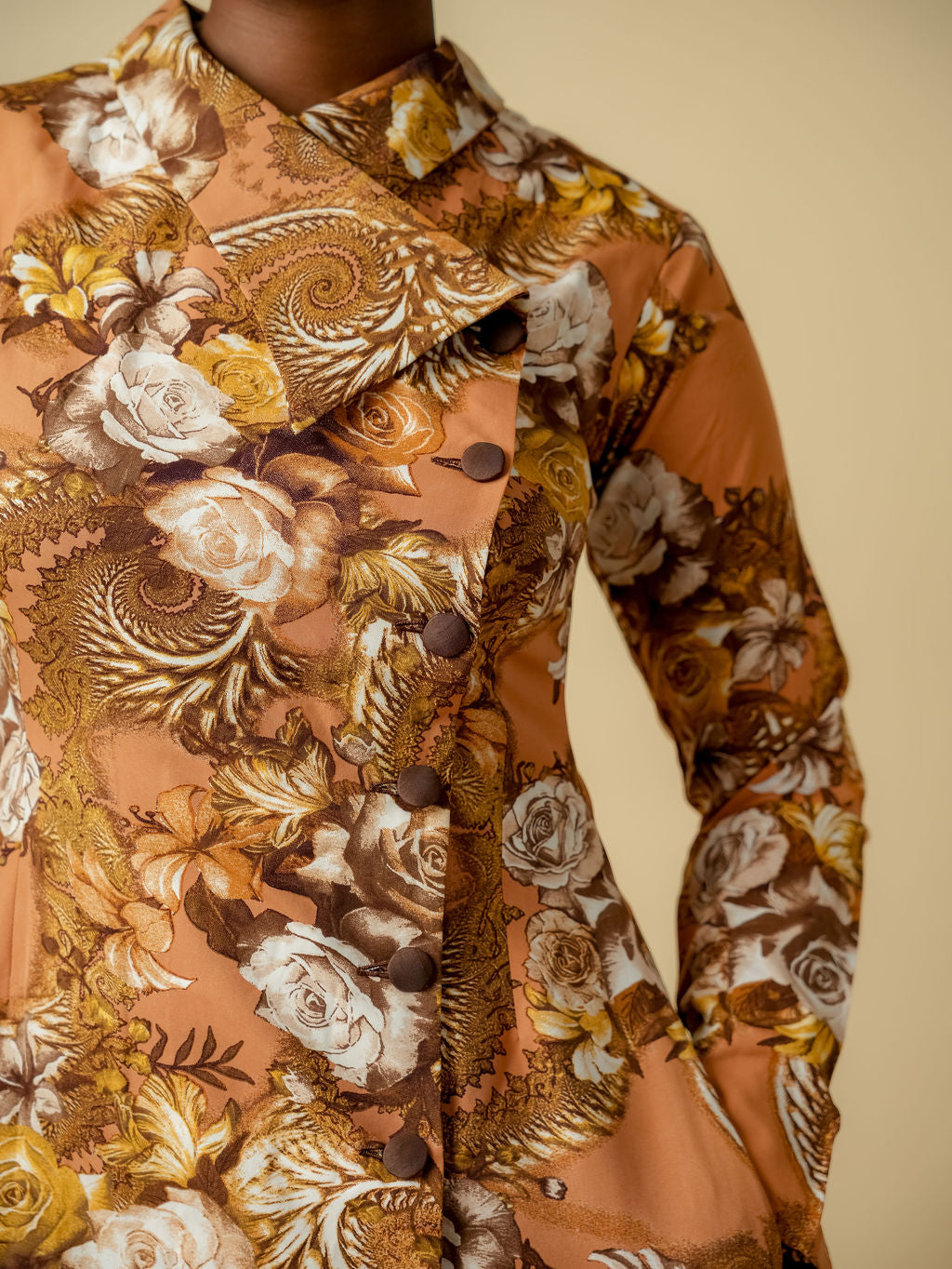 Step into heritage-inspired glamour with the Amina Amber Rose Rap Dress from Animabakar Designs. Rich amber gold serves as the backdrop for an ornate floral pattern in shades of ivory, bronze, and warm yellow. The structured high collar and asymmetrical button-down front lend a regal touch, while the tailored long sleeves and full-length skirt maintain an elongated, elegant silhouette.