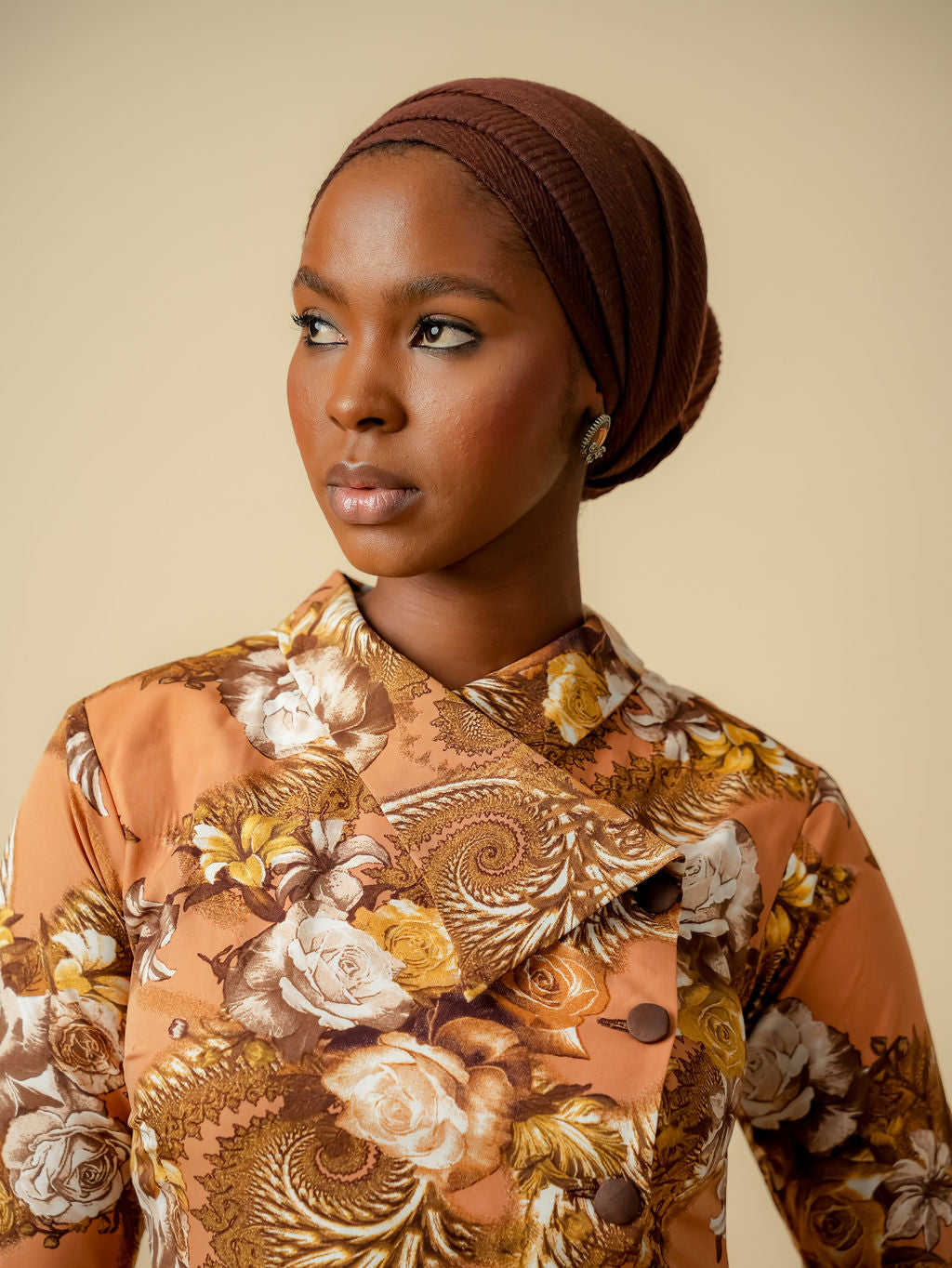 This striking piece is ideal for weddings, formal occasions, or cultural celebrations. Pair with gold drop earrings, neutral heels, and a matching amber or ivory headscarf for a complete, high-impact ensemble.